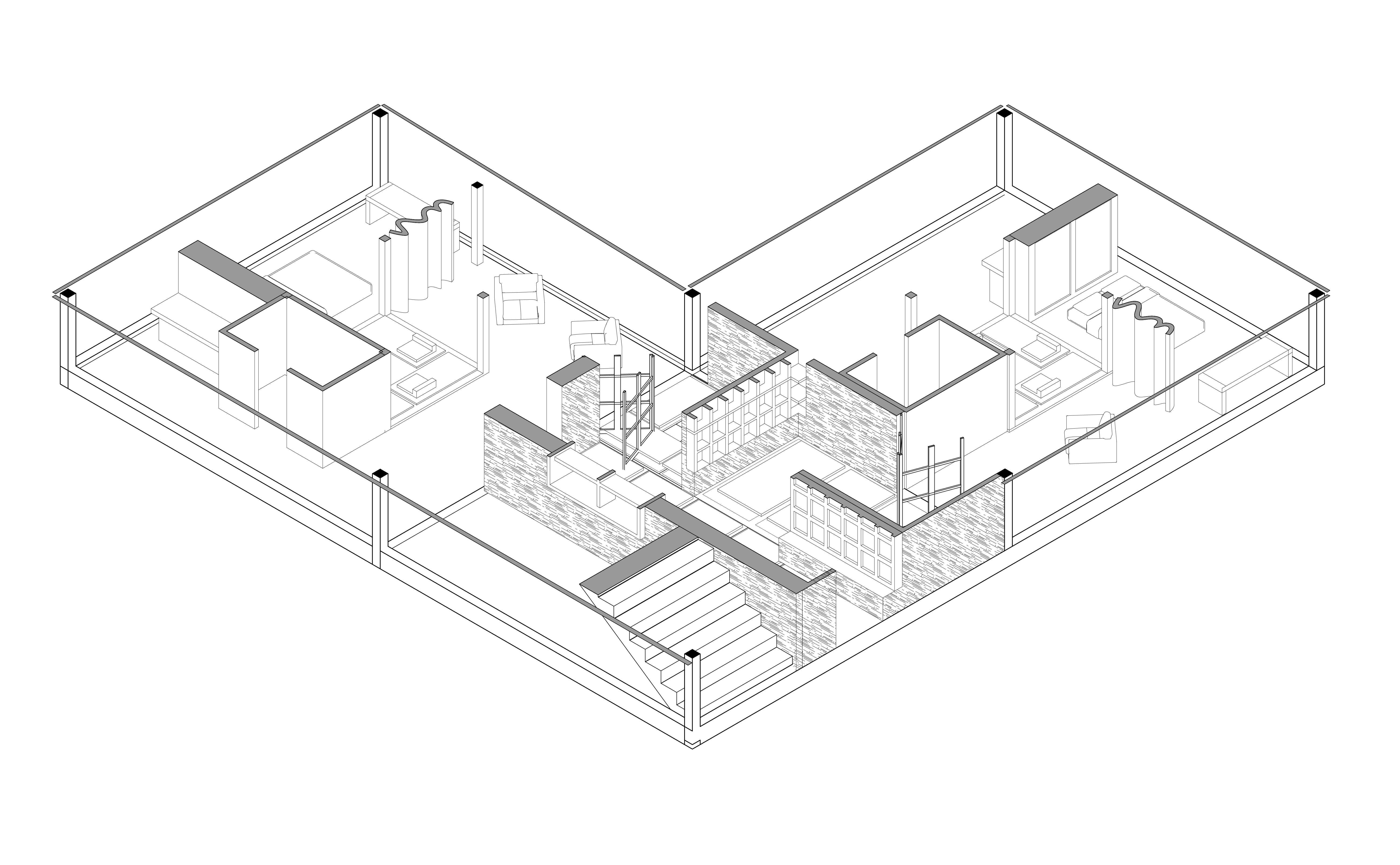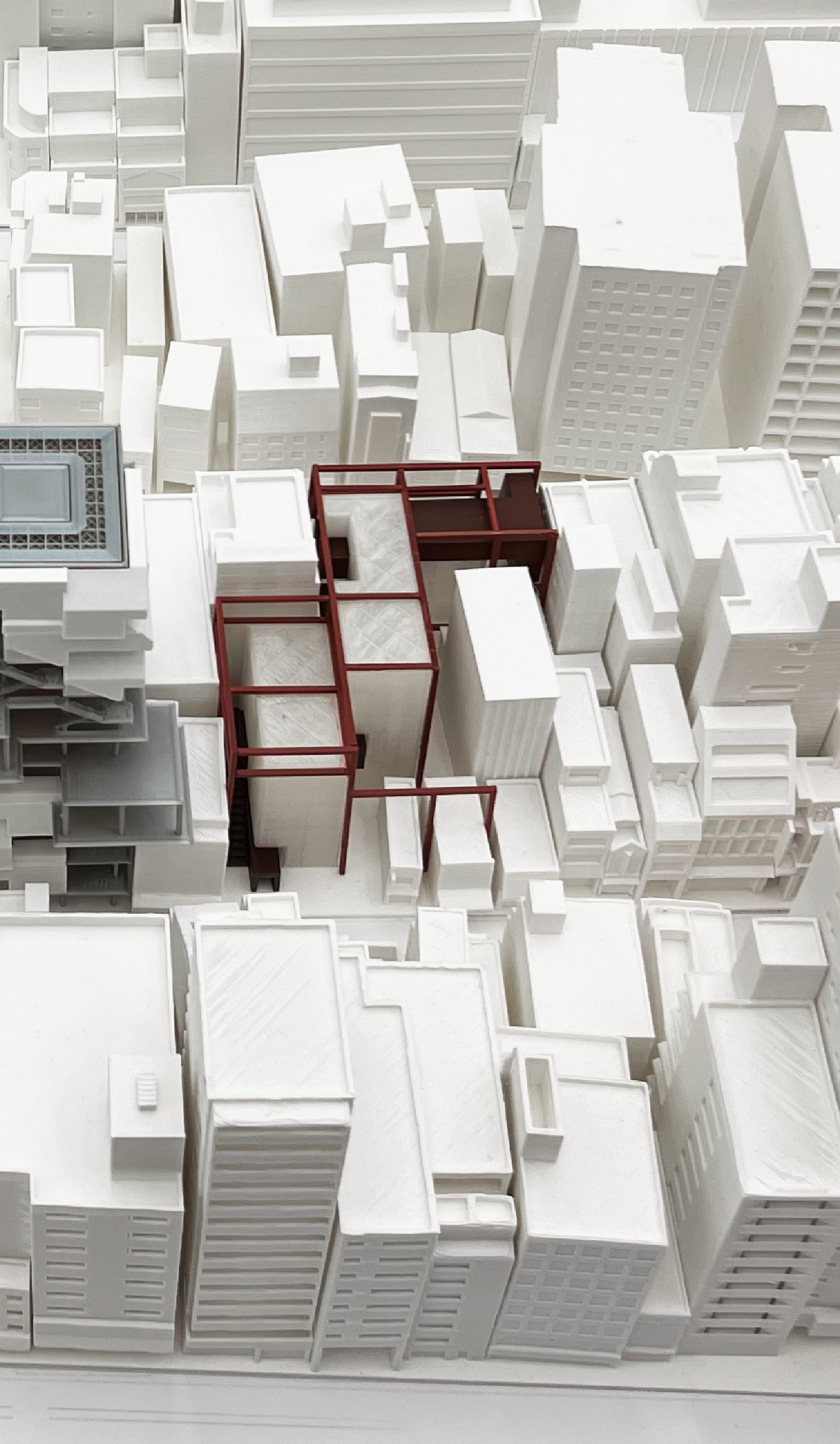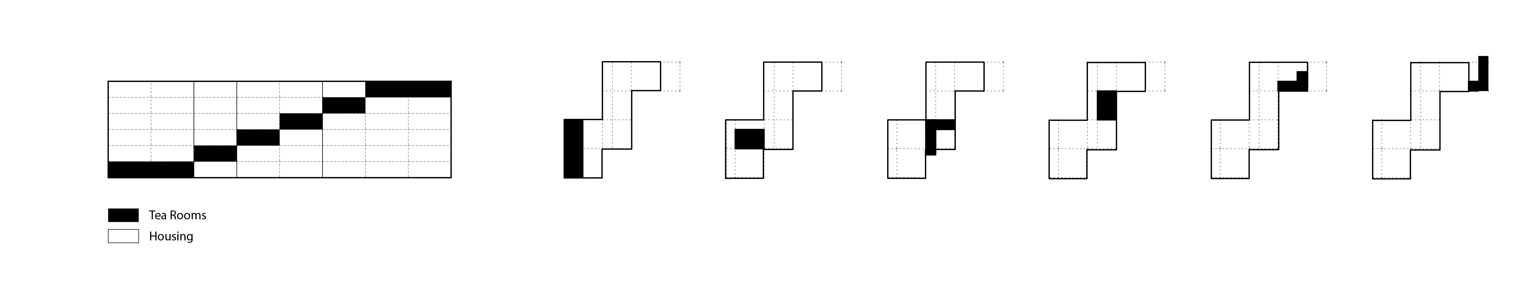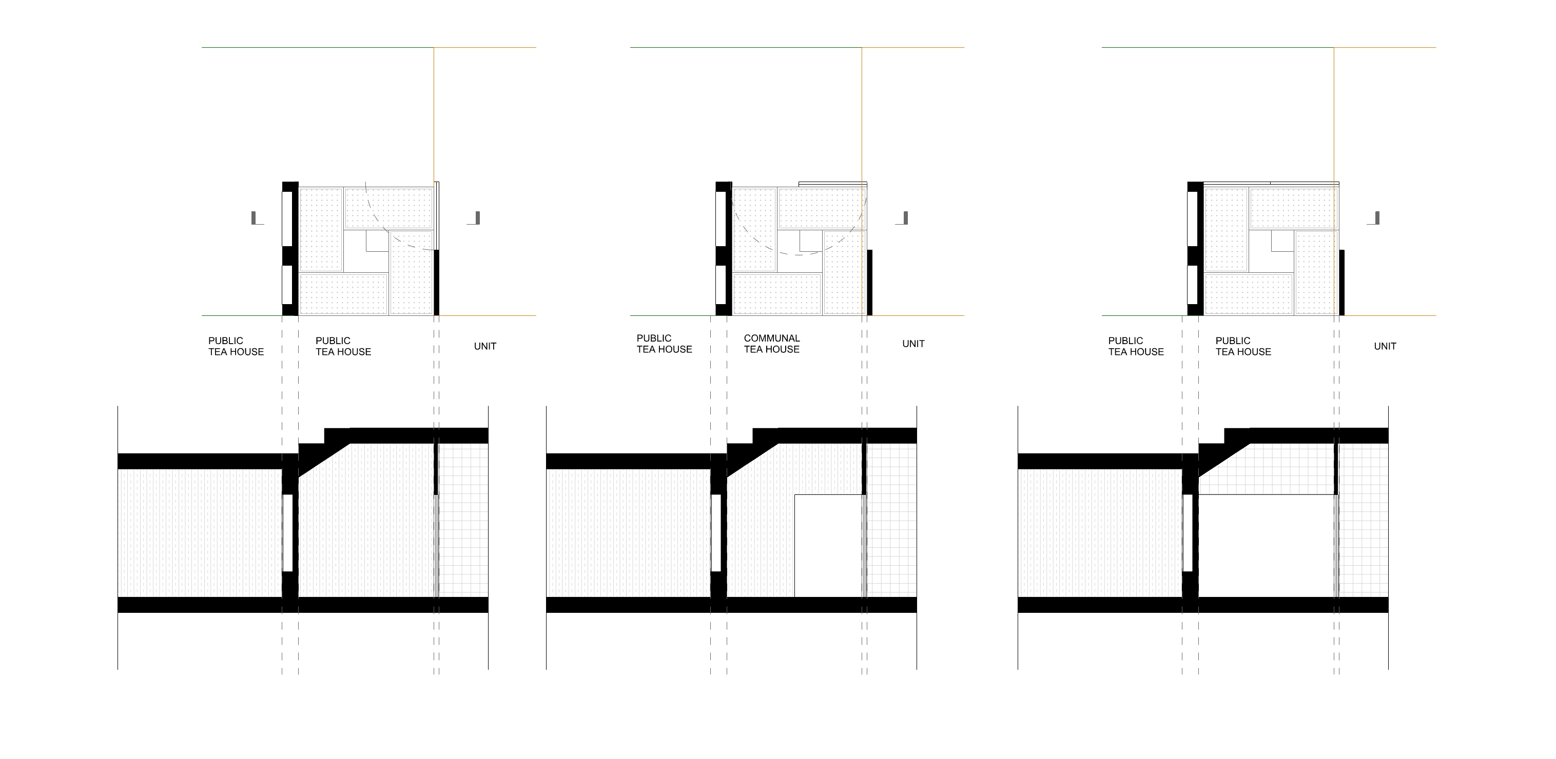 In this “House +” project, multiple tea rooms are embedded into a standard 8m by 8m steel frame structure. They interact with the living units at each floor level, from the bottom to the top. Urbanistically, the project encourages the public to experience the tearooms linearly and vertically. Domestically, the tea rooms engage with the adjacent units through a flexible device - a rotatable door, which allows the transformation of the tea rooms into either public or communal or completely private. The shared tea rooms blur the boundaries between units, creating semi-public spaces for communication, both between the neighbors and between the dwellers and visitors from the rest of the city.
