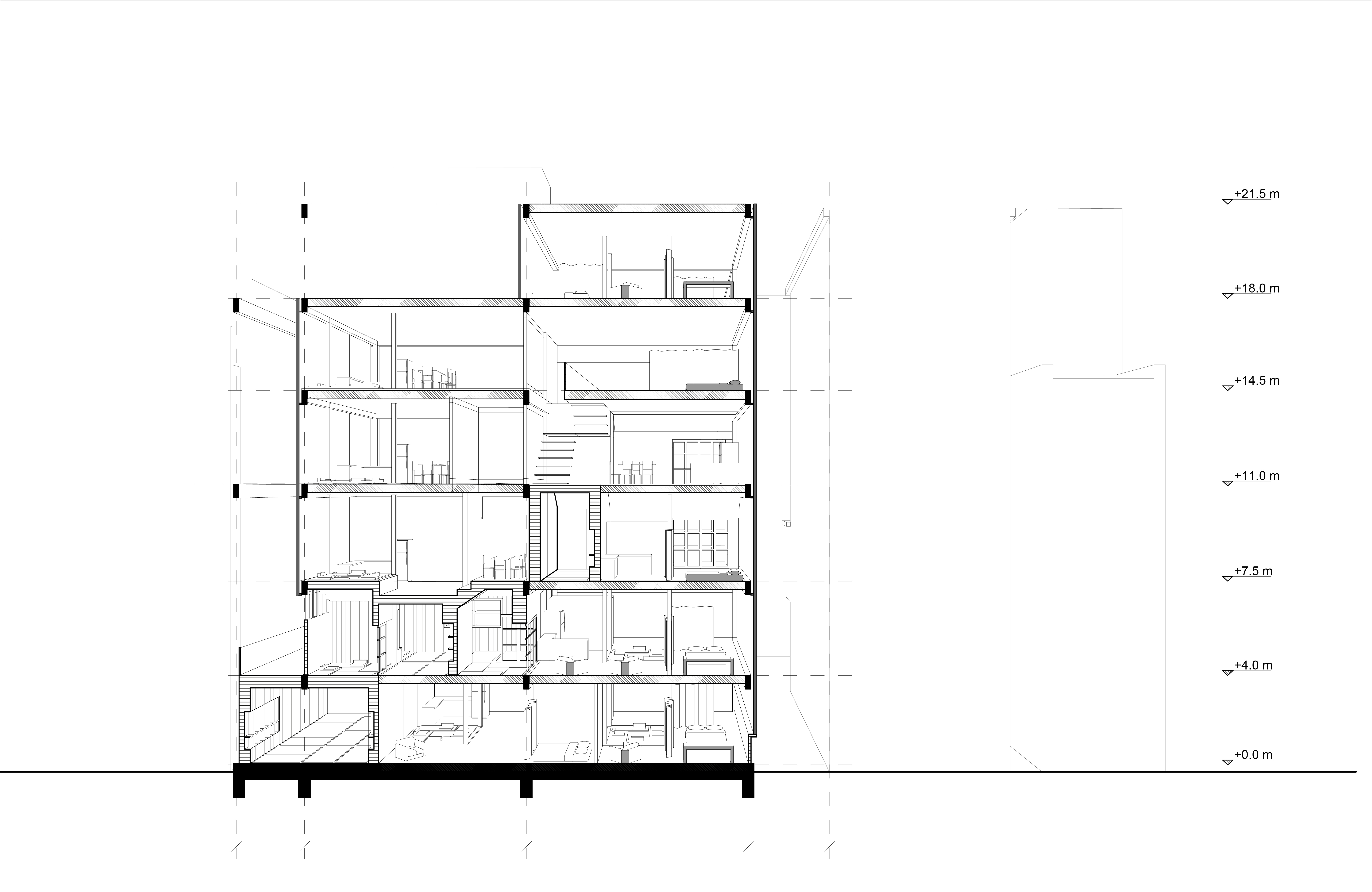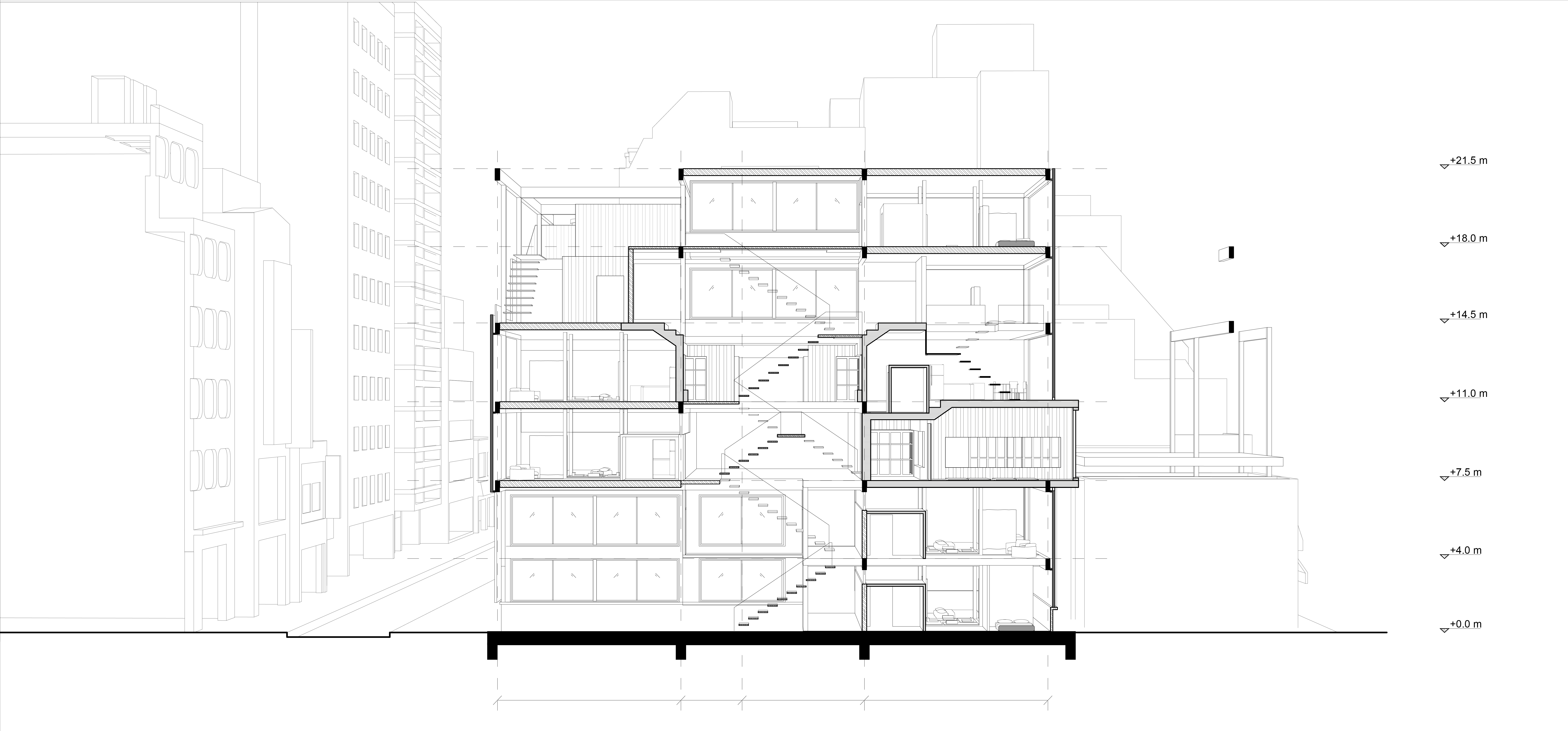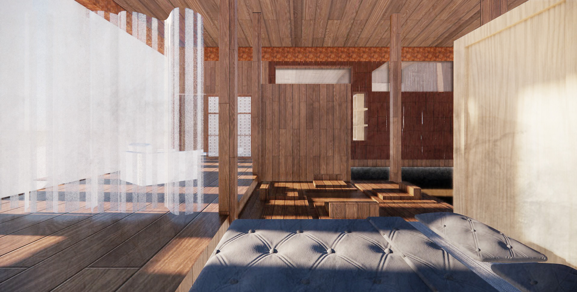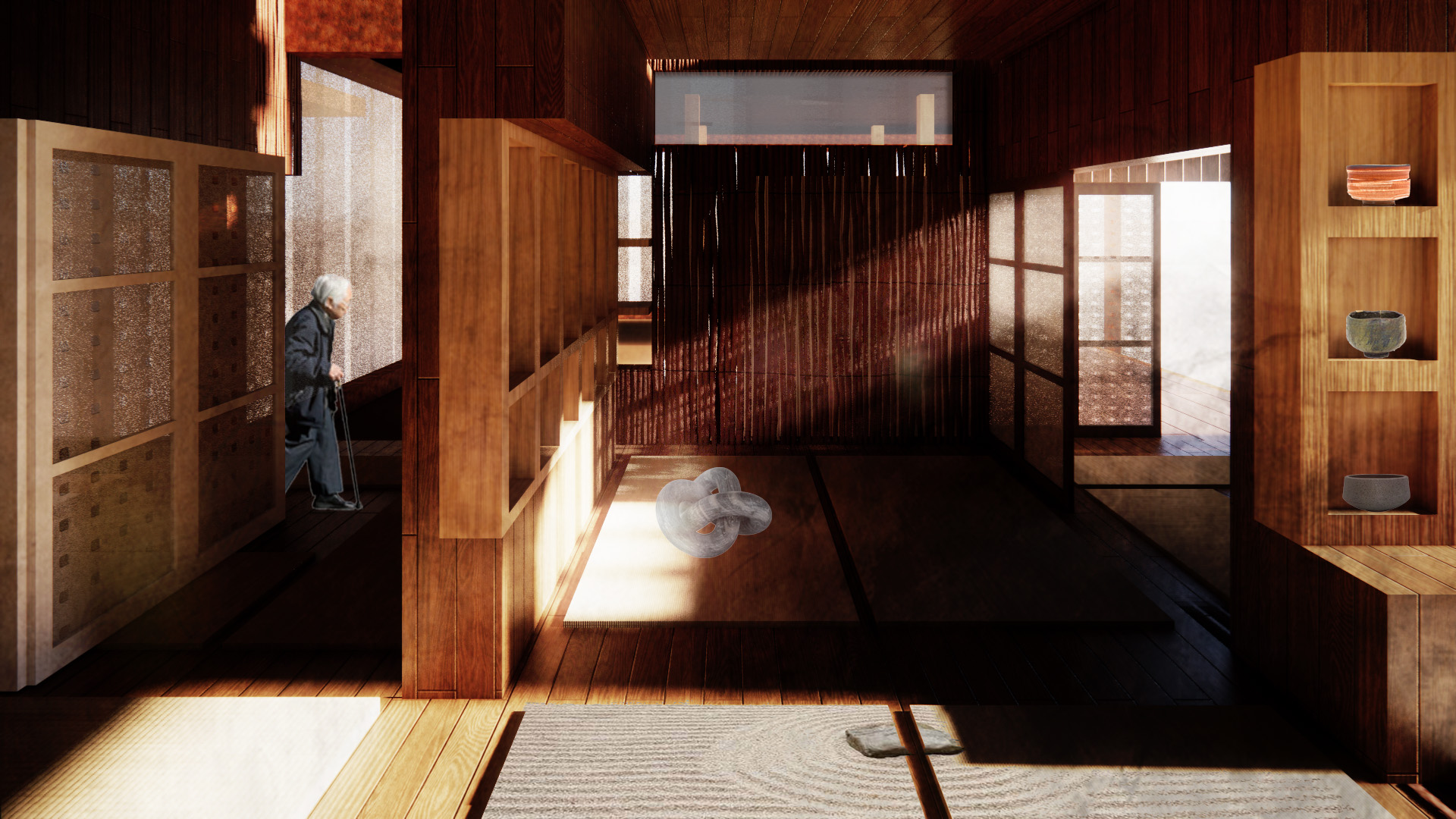 The contrast between lightness and heaviness is a crucial theme of this project: the living units are enclosed by a glass façade while the tea rooms are enveloped by wooden panels. The intention is to create more intimate spaces in the tea rooms while maximizing the lighting condition within the living units.