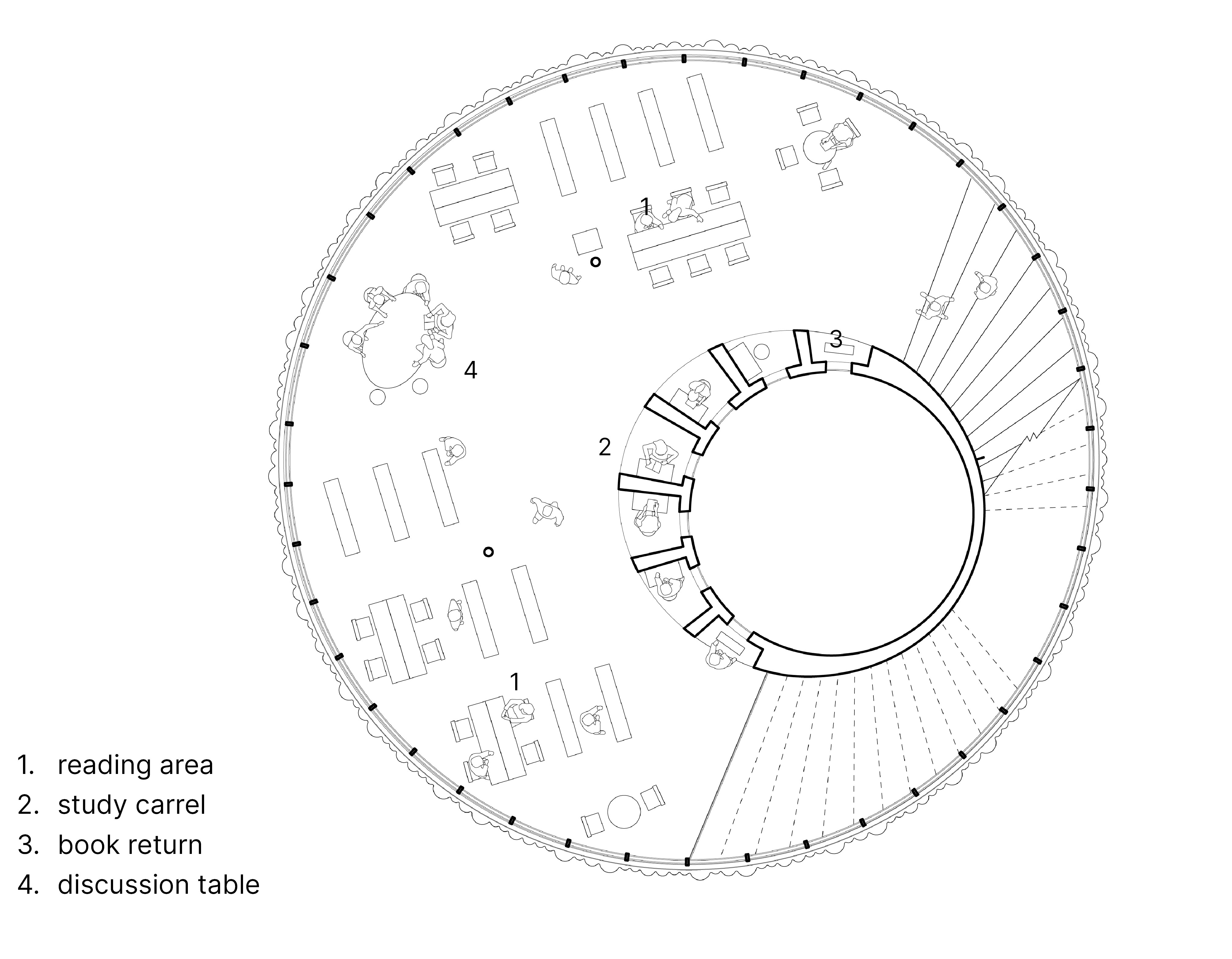 Programs such as study carrels carve into the thickness of rammed earth wall, creating meditative spaces for individual learnings.