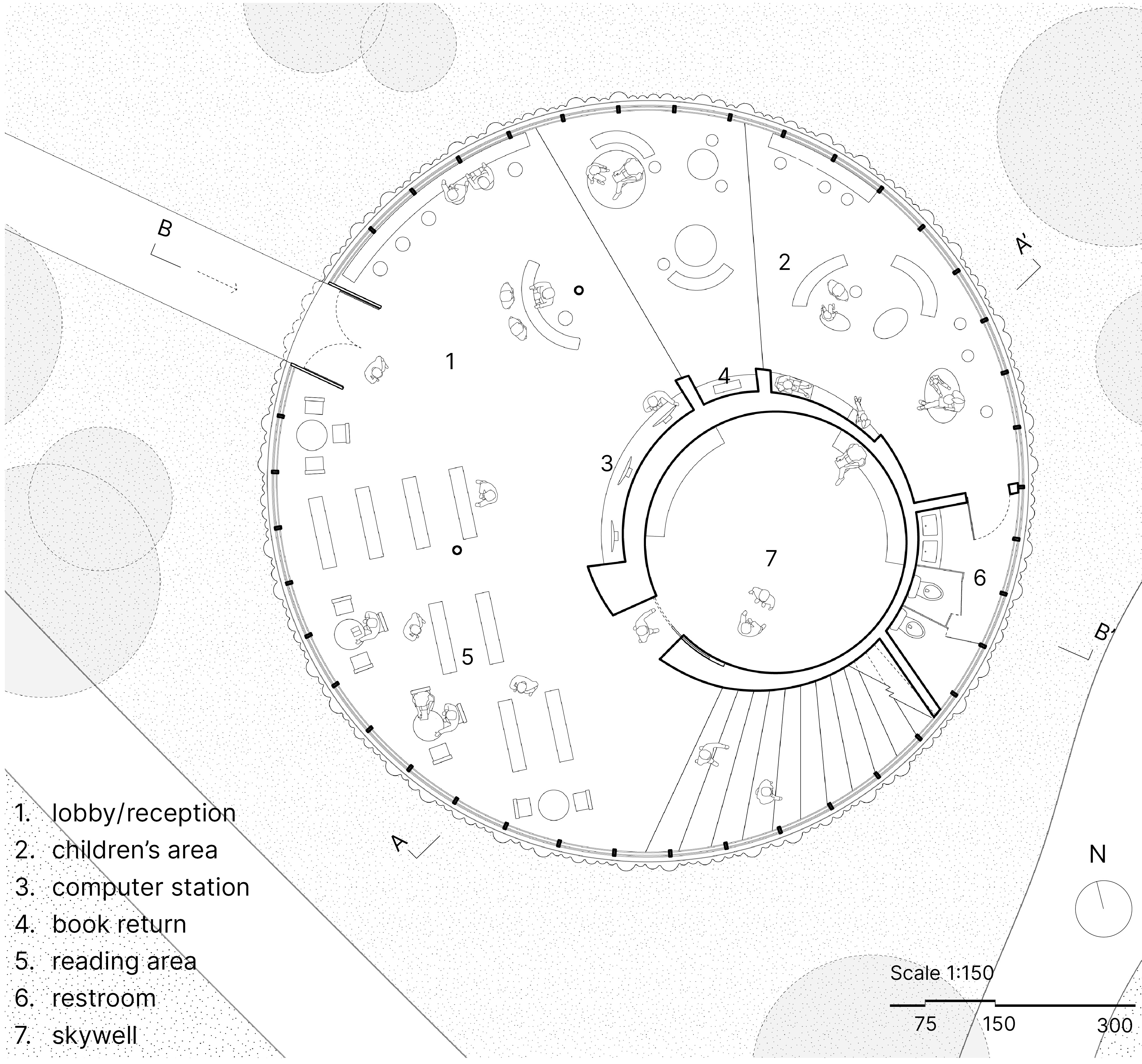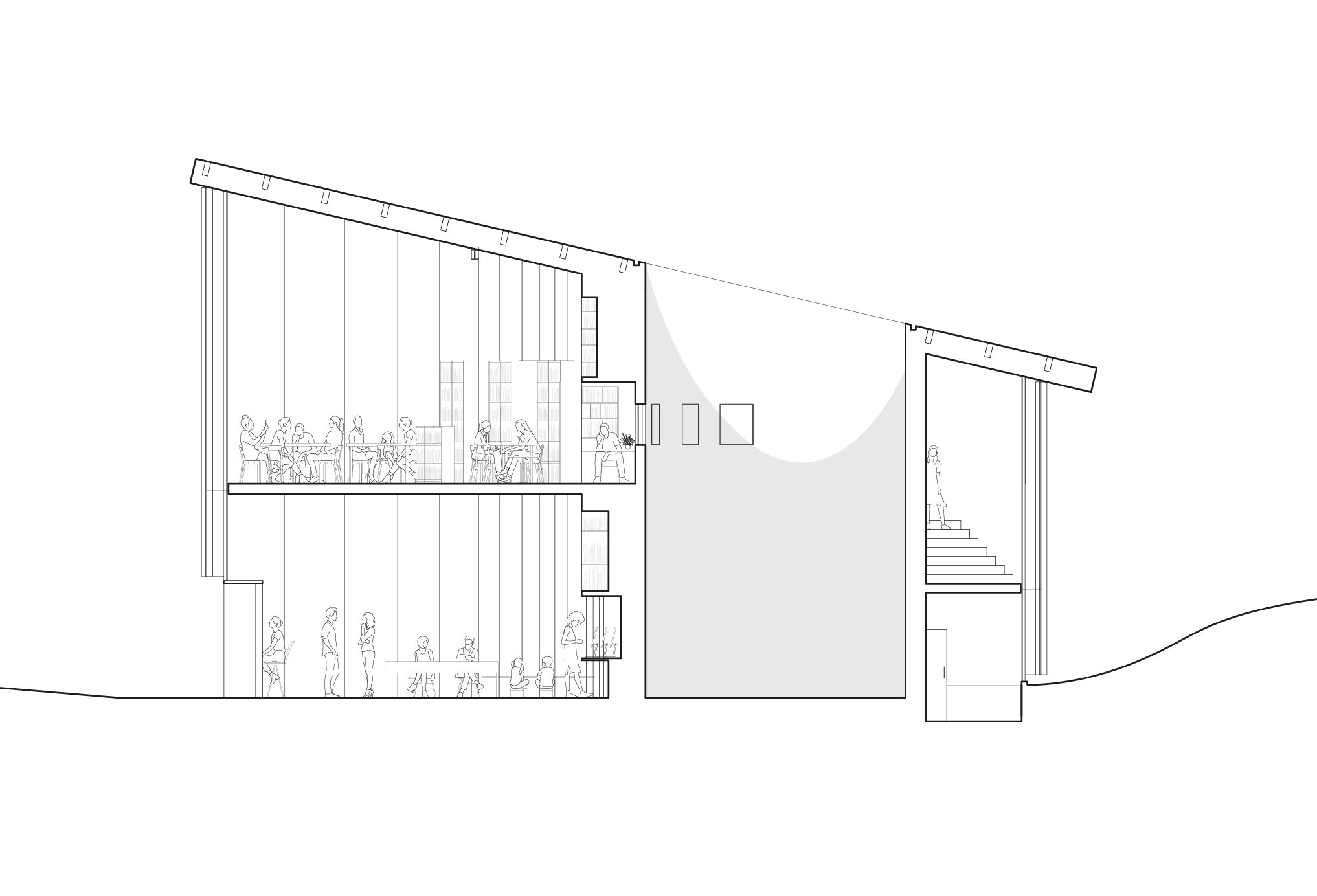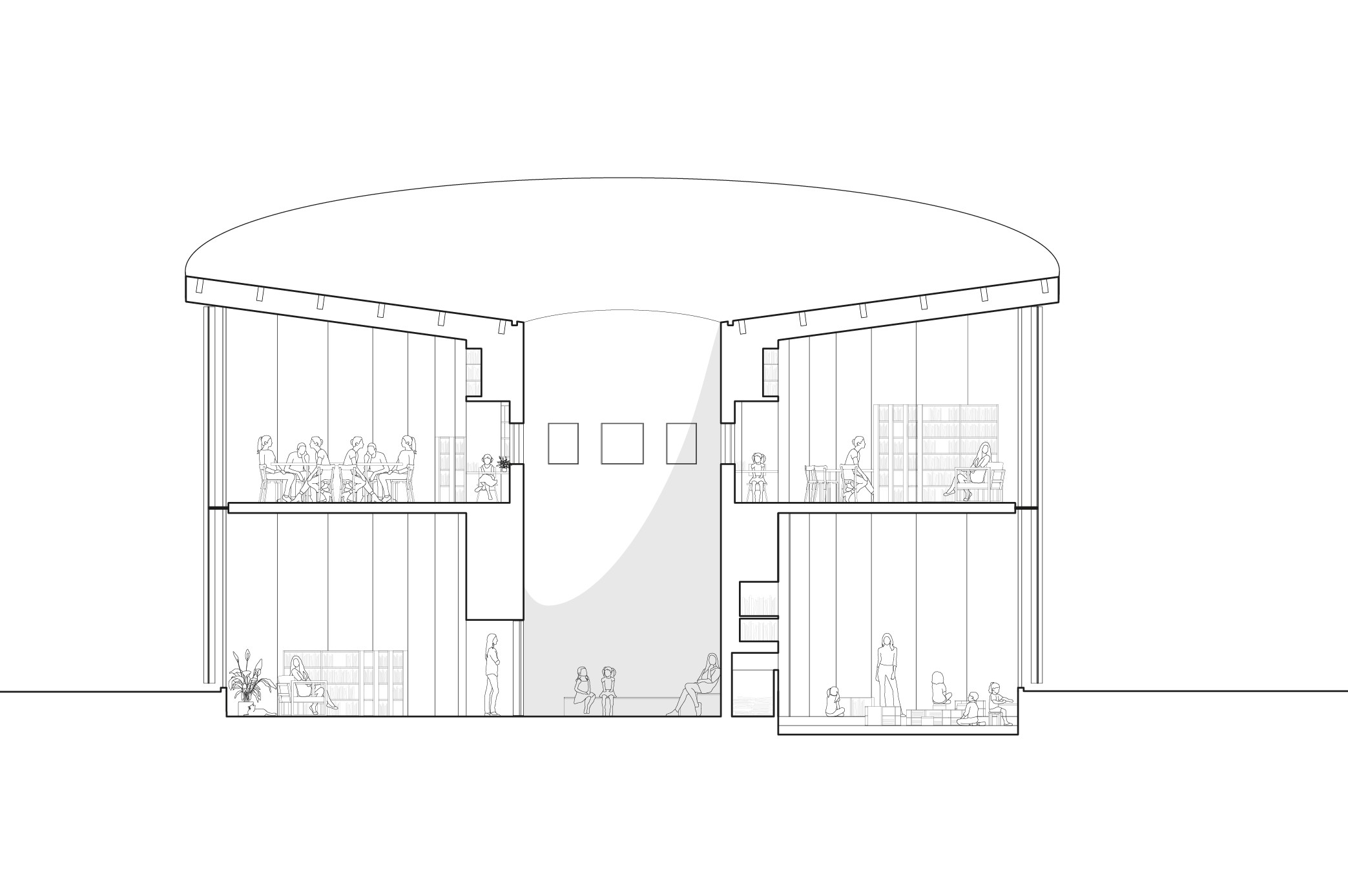 and evanescent perception. The earth tone skywell creates a contemplative space enabling readers to reconnect with knowledge in the sound of nature.