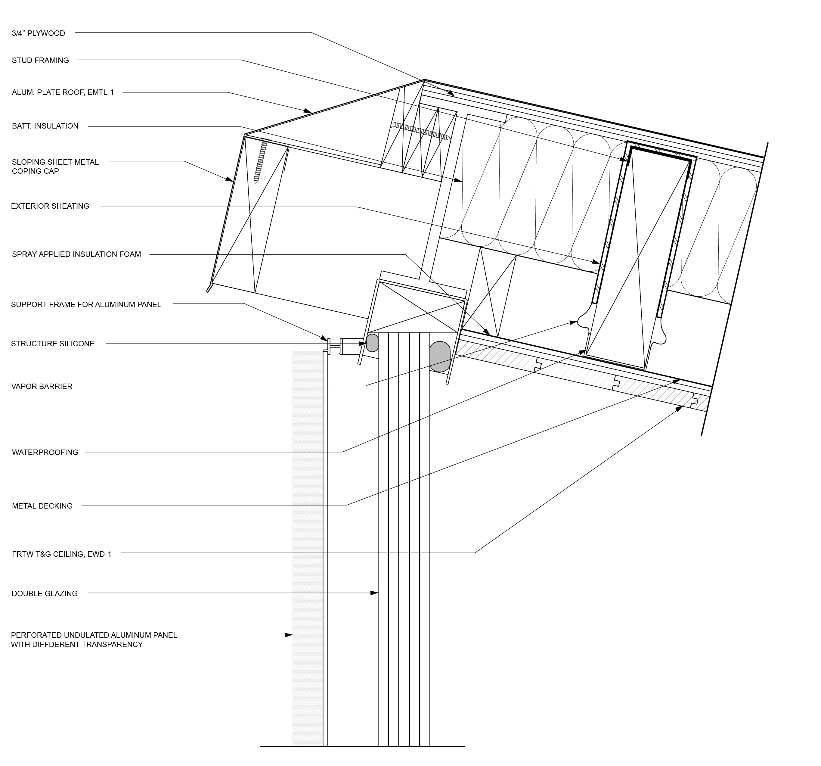 environmental friendly local source material of rammed earth in the central skywell, the design reverse the original monolithic appearance of Tulou into perforated aluminum with different degrees of transparency, offer an enigmatic